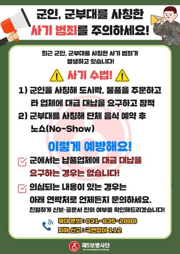 육군 5사단은 최근 군인이나 군부대를 사칭해 대금 대납을 요구하거나 음식 예약 후 자리에 나타나지 않는 '노쇼' 피해를 막기 위한 예방 포스터를 제작했다고 18일 밝혔다.