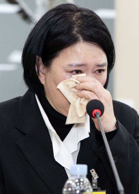 직장 내 괴롭힘으로 숨진 기상캐스터 고(故) 오요안나 씨의 어머니인 장연미 씨가 18일 오전 서울 여의도 국회에서 열린 제424회 국회(임시회) 과학기술방송통신위원회 제2차 전체회의에서 눈물을 흘리고 있다.(사진=뉴스1) |