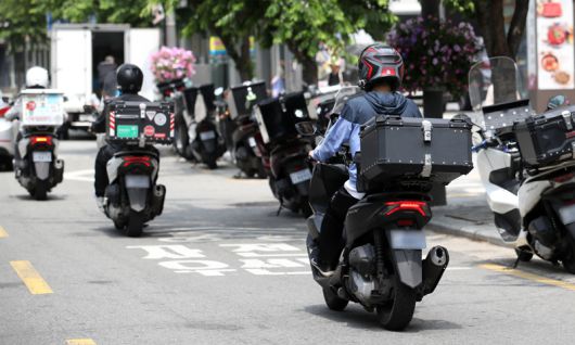 서울 시내에서 배달 노동자들이 오토바이를 타고 이동하고 있다. 뉴시스 |