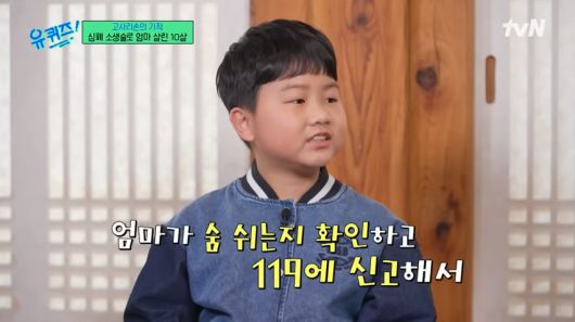 [헤럴드경제=김유진 기자] 초등학교에서 배운 심폐소생술(CPR)로 쓰러진 엄마를 살려낸 10살 정태운 군의 사연이 화제다. 정군은 자난 16일 tvN ‘유 퀴즈 온 더 블록’에 출연해 당시 상황에 대해 직접 설명했다.