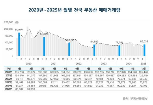 2020년~2025년 월별 전국 부동산 매매거래량. [자료=부동산플래닛] |