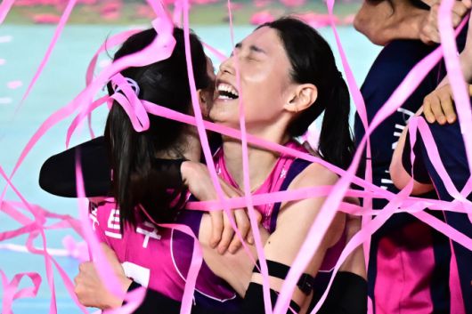 [서울=뉴스핌] 장환수 스포츠전문기자= 현역 마지막 경기에서 팀의 통합 우승을 이끌며 시리즈 MVP에 선정된 흥국생명 김연경이 8일 정관장과 챔프 5차전이 끝난 뒤 투트쿠와 포옹을 하고 있다. [사진=KOVO] 2025.04.08 zangpabo@newspim.com |