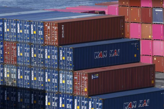 화물 컨테이너가 미국 캘리포니아 롱비치 로스앤젤레스 항구에 쌓여 있다. EPA 연합뉴스 |