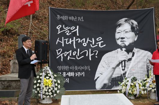 이상섭 전국금속노동조합 수석부위원장은 “홍세화 선생님께서 우리 곁을 떠나신지 1주기가 되는 날”이라며 “윤석열이 더 이상 대통령이 아닌 세상 14일 차의 아침인데, 선생님이 살아계셔서 오늘 아침 공기와 바람을 같이 맞을 수 있다면 참 좋겠다, 참 좋아하셨겠다라는 생각을 했다”고 말했다. 그는 이어 “선생님께서는 일생을 ‘깨어서 생각하는 사람’으로, ‘침묵을 넘어, 말하는 양심’으로 사셨고, 언제나 약자의 편에 서셨고, 불의에 맞서는 것을 주저하지 않으셨다”며 “선생님의 말과 글, 그리고 삶은 여전히 우리 곁에 남아 삶과 운동의 기준이 되고 있고, 그 가르침은 앞으로도 길이 되어 우리를 이끌어줄 것”이라고 덧붙였다.