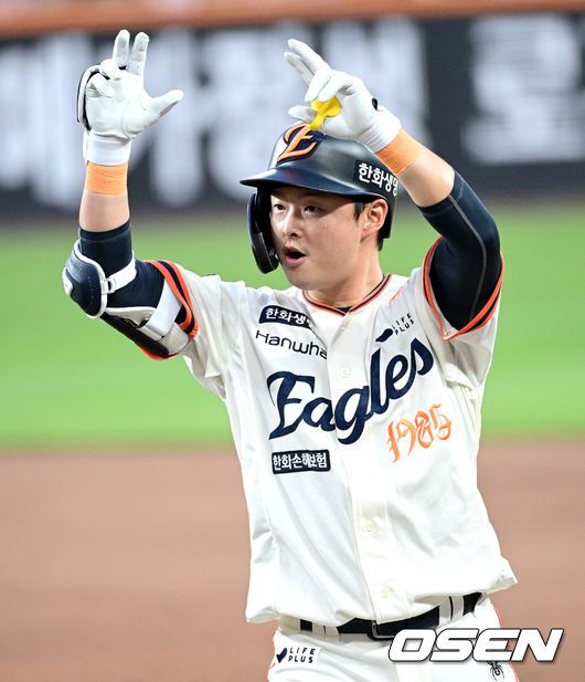 [OSEN=대전, 최규한 기자] 18일 오후 대전 한화생명 볼파크에서 ‘2025 신한 SOL Bank KBO리그’ 한화 이글스와 NC 다이노스의 경기가 열렸다. 홈팀 한화는 엄상백, 방문팀 NC는 로건 앨런을 선발로 내세웠다. 1회말 2사 만루 상황 한화 이도윤이 달아나는 2타점 적시타를 날리고 1루에 안착해 기뻐하고 있다. 2025.04.18 / dreamer@osen.co.kr