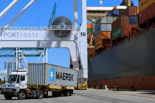 한 화물선이 지난 15일 미국 플로리다주 마이애미항에서 컨테이너를 하역하고 있다. 마이애미=AFP 연합뉴스 |