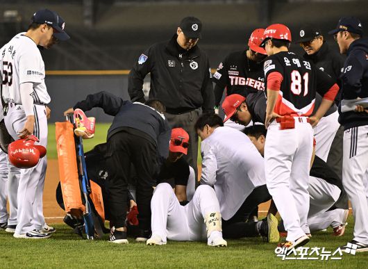 (엑스포츠뉴스 잠실, 김근한 기자) KIA 타이거즈 베테랑 내야수 김선빈이 1군 복귀 당일 1루 충돌로 대형 부상을 당했다. 윗 입술이 찢어져 봉합술을 받아야 하는 가운데 치아와 턱 관절 이상 검진을 위해 엑스레이와 CT 촬영이 이뤄질 수 있다.