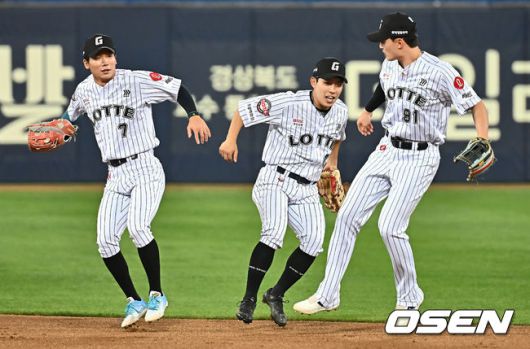 [OSEN=대구, 이석우 기자] 18일 대구삼성라이온즈파크에서 2025 신한 SOL 뱅크 KBO 리그 삼성 라이온즈와 롯데 자이언츠의 경기가 열렸다. 홈팀 삼성은 이승현이, 방문팀 롯데는 데이비슨이 선발 출전했다. 롯데 자이언츠 윤동희와 외야수들이 삼성 라이온즈에 8-1로 승리한 후 기쁨을 나누고 있다. 2025.04.18 / foto0307@osen.co.kr