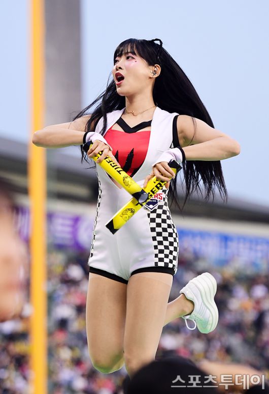 [스포츠투데이 권광일 기자] 2025 신한은행 SOL Bank KBO리그 KIA 타이거즈와 두산 베어스의 경기가 18일 서울 잠실야구장에서 열렸다. KIA 치어리더 김한나가 신나는 응원을 선보이고 있다. 2025.04.18. [스포츠투데이 권광일 기자 sports@stoo.com]