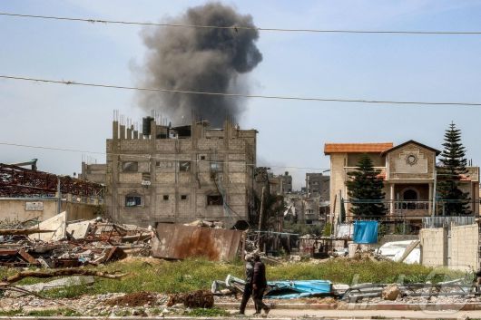 25일(현지시간) 팔레스타인 가자 지구의 누세이라트 난민 캠프에서 이스라엘 군의 포격을 받은 건물서 연기 기둥이 솟아 오르고 있다. 2025.03.26 ⓒ AFP=뉴스1 ⓒ News1 우동명 기자 |