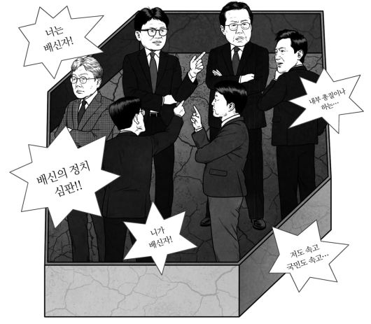 보수 진영 내부에서 또 '배신자 논쟁'이 휩쓸고 있다. 배신자는 누구인가. 아니, 배신은 과연 무엇인가. /일러스트=한상엽 |