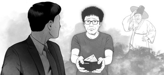 노인은 분이 안 풀리는 듯 자기 가슴팍을 쾅쾅 쳤다. “그래서 그냥 냅다 목을 졸라버렸지! 당장 안 돌려놓으면 다 죽는 거라고! 에휴, 겨우 돌려놓게 했네.” 노인은 퀭한 눈으로 허공을 노려봤다. 그 시선 끝에는, 방금 지갑을 돌려주고 후다닥 도망치는 자기 손주의 모습이 아른거렸다. 조상 복 없다고 한탄하던 소매치기의 뒷모습 말이다. “에휴, 내 팔자야. 후손 복은 지지리도 없구먼….”