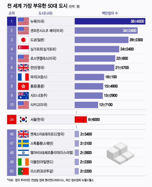 세계 최고의 부자 보유 도시는 미국 뉴욕인 것으로 나타났다. 백만장자 수가 총 38만4500명에 달했다. 2위 역시 미국으로 34만2400명의 샌프란시스코 베이 지역이었다. 이밖에도 로스앤젤레스, 시카고, 휴스턴, 달라스, 시애틀, 보스턴, 마이애미 등 총 11곳의 미국 도시가 전 세계 가장 부유한 50대 도시에 이름을 올렸는데 국가 별로 봤을 때 가장 많았다.