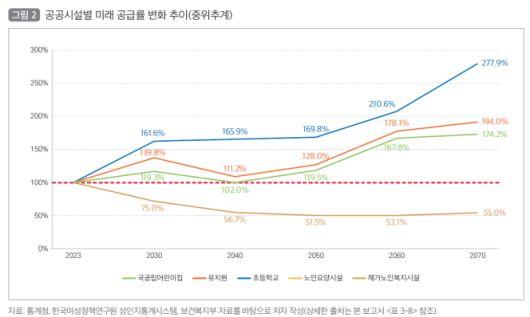 이에 공공시설 공급 현황(2013~2023년)을 분석해 과거 공급 규모대로 미래 공급량을 예측한 결과 초등학교 수는 2023년 대비 2070년 277.9% 증가한다. 반면 노인요양시설은 55.0% 수준으로 감소할 것으로 예상됐다. 세대에 따른 공공시설 공급 불균형이 심해질 것으로 전망됐다.