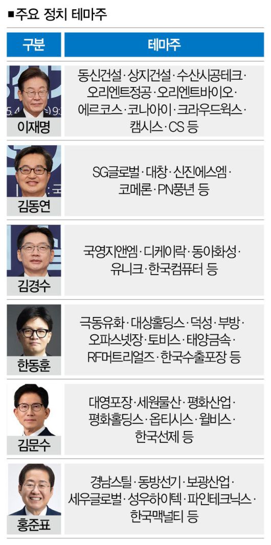 지난해 4월 치러진 22대 국회의원 선거와 12·3 비상계엄 사태로 확산한 정치적 불확실성이 정치인 테마주의 변동성을 높였다는 게 한국거래소의 분석이다. 이런 측면에서 정치 이슈 중 가장 큰 대선을 앞둔 상황에서 정치 테마주가 꿈틀거리는 건 어쩌면 당연한 일이다.