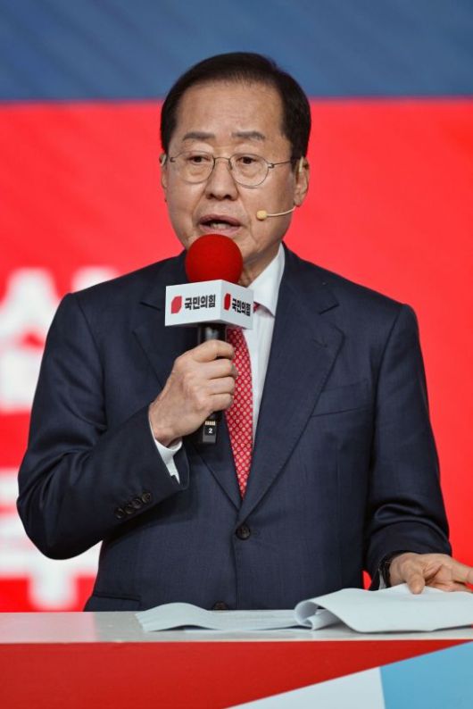 18일 서울 강서구 ASSA 아트홀에서 열린 ‘제21대 대통령 후보자 국민의힘 1차 경선 후보자 비전대회’에서 홍준표 후보가 비전발표를 하고 있다. 2025.04.18. 국회사진기자단 |