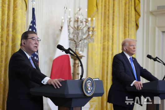 [워싱턴=AP/뉴시스] 이시바 시게루 일본 총리가 7일(현지 시간) 백악관에서 도널드 트럼프 미국 대통령과 정상회담을 한 후 공동 기자회견을 진행하고 있다. 2025.02.07 |