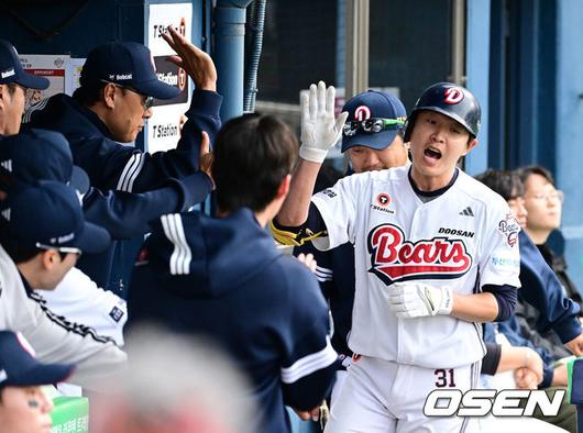 [OSEN=잠실, 지형준 기자] 19일 오후 서울 잠실구장에서 2025 신한 SOL뱅크 KBO리그 두산 베어스와 KIA 타이거즈의 경기가 열렸다. 이날 두산은 최원준, KIA는 아담 올러를 선발로 내세웠다. 1회말 무사에서 두산 정수빈이 선두타자 홈런을 날리며 이승엽 감독과 기뻐하고 있다. 정수빈은 1500안타를 달성했다. 2025.04.19 / jpnews@osen.co.kr