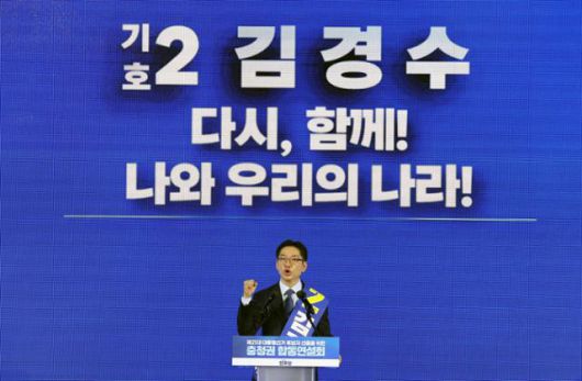 김경수 전 경남지사가 19일 오후 충북 청주시 서원구 청주체육관에서 열린 제21대 대통령선거 후보자 선출을 위한 충청권 합동연설회에 참석해 정견 발표를 하고 있다. 청주=뉴시스 |
