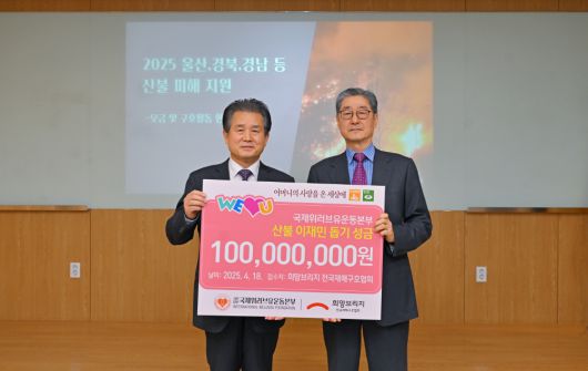 유엔 DGC(공보국) 협력단체인 국제위러브유운동본부(회장 장길자, 이하 위러브유)가 18일 서울 마포구 희망브리지 전국재해구호협회를 방문해 영남권 산불 이재민 구호성금 1억 원을 기탁했다. 성금은 피해 복구와 이재민 생계 지원, 소방 관계자 지원 등 다방면에 쓰일 전망이다.