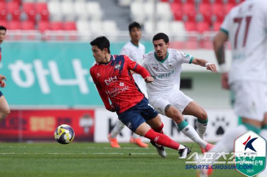 기세를 탄 대전이 또 찬스를 잡았다. 33분 안톤의 롱패스를 받은 주민규가 멋진 트래핑 후 키핑하며 뒤로 내줬다. 강윤성이 뛰어들며 중거리 슈팅을 연결했다. 크로스바를 넘어갔다.