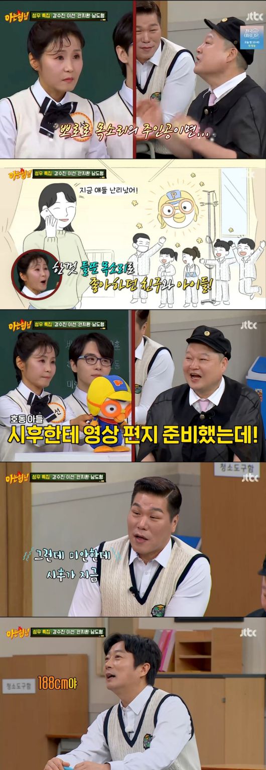 19일 방송된 JTBC '아는 형님'에는 자타공인 대한민국 대표 성우 강수진, 이선, 안지환, 남도형이 출연해 전 세대를 아우르는 만화 주인공들의 목소리로 형님들을 사로잡았다.