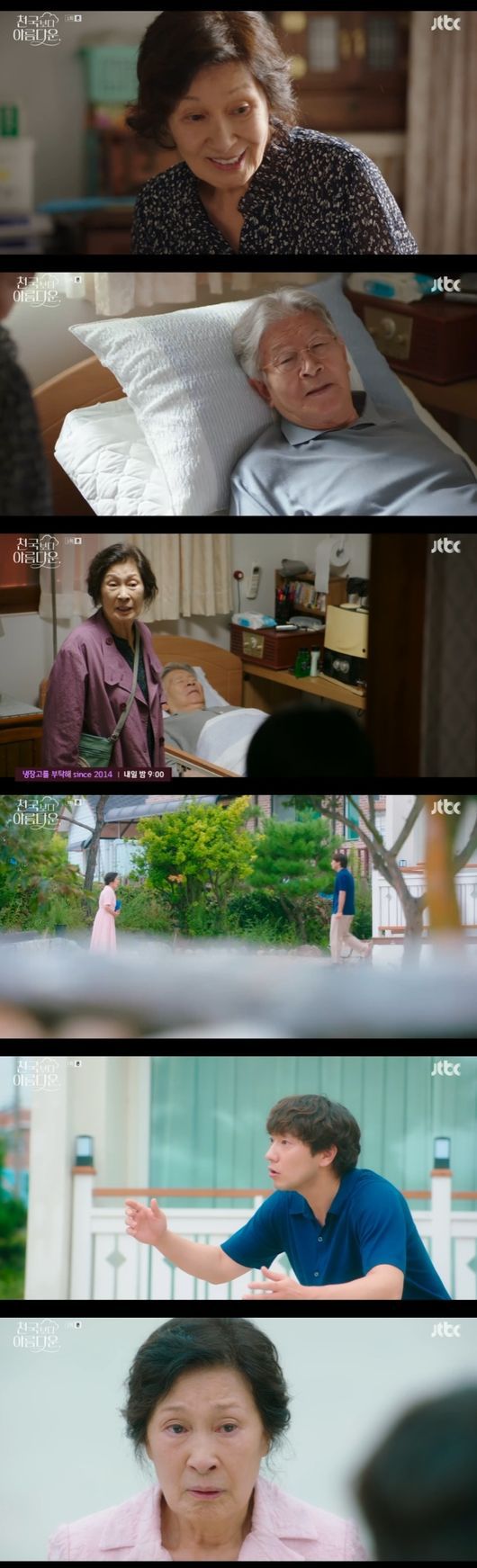 19일 방송된 JTBC 새 토일드라마 '천국보다 아름다운'에서는 하반신 마비 남편 고낙준(박웅 분)을 떠나보낸 뒤 1년, 천국에서 그와 재회한 이해숙(김혜자 분)의 모습이 그려졌다.