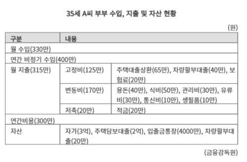 35세 A씨 부부 월 수입은 330만원이다. 이와 별도로 연간 비정기 수입은 400만원이다. 월 지출은 315만원이다. 고정비가 125만원으로 주택대출상환(65만원)과 차량할부대출(40만원), 보험료(20만원)가 나간다. 변동비는 용돈(40만원), 식비(50만원), 관리비(30만원), 유류비(30만원), 통신비(10만원), 생필품(10만원) 등을 합쳐 총 170만원이다. 저축은 적금(20만원)을 하고 있다. 연간 비용은 300만원이다. 자산은 입출금통장에 4000만원이 있고 자가(3억), 주택담보대출(2억), 차량할부대출(20만원) 등이 있다. 부채는 따로 없다.