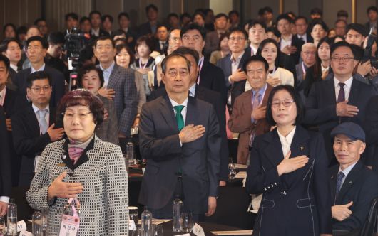 한덕수 대통령 권한대행 국무총리(가운데)가 18일 서울 페어몬트 앰배서더 호텔에서 열린 장애인의 날 기념식에서 국기에 경례하고 있다. [연합] |