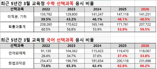 미적분·기하는 통합 대학수학능력시험(수능)이 도입된 2022학년도 39.5%, 2023학년도 43.2%, 2024학년도 46.1%, 2025학년도 46.1%를 기록하다 2026학년도에는 40.5%로 하락세로 전환했다.