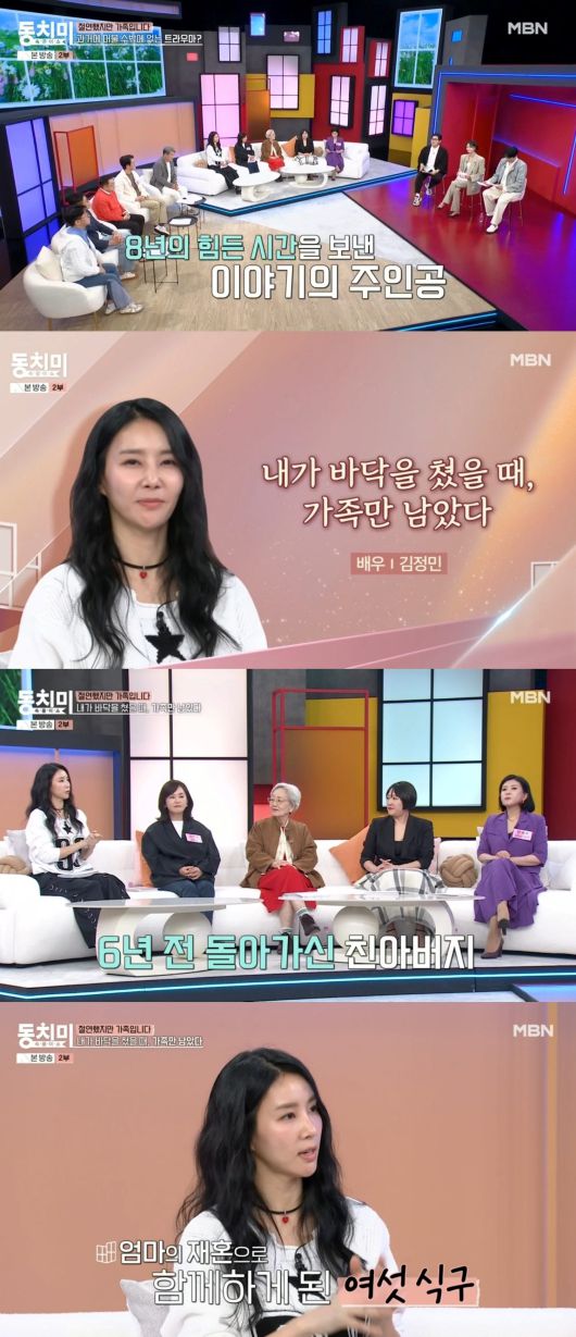 '내가 바닥을 쳤을 때, 가족만 남았다'라는 주제가 공개되고 김정민은 "조금 헷갈릴 수 있을 것 같다. 친아버지는 아까 말씀드린 것처럼 몇 해 전에 돌아가셨다. 엄마가 재혼을 한 새아버지가 있다. 그렇게 여섯 가족이고 저와 막내가 엄마 쪽, 둘째 셋째 남동생이 아빠 쪽이다"라고 설명했다.
