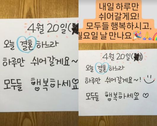 그는 "4월 20일 오늘 결혼하느라 하루만 쉬어갈게요. 모두들 행복하세요"라고 웃으며 새신부의 기쁨을 밝혔다. 또한 "내일 하루만 쉬어갈게요! 모두들 행복하시고 월요일 날 만나요"라고 덧붙여 결혼식 이후에도 계속해서 카페 사장으로서 '열일' 계획을 밝혀 놀라움을 더했다.