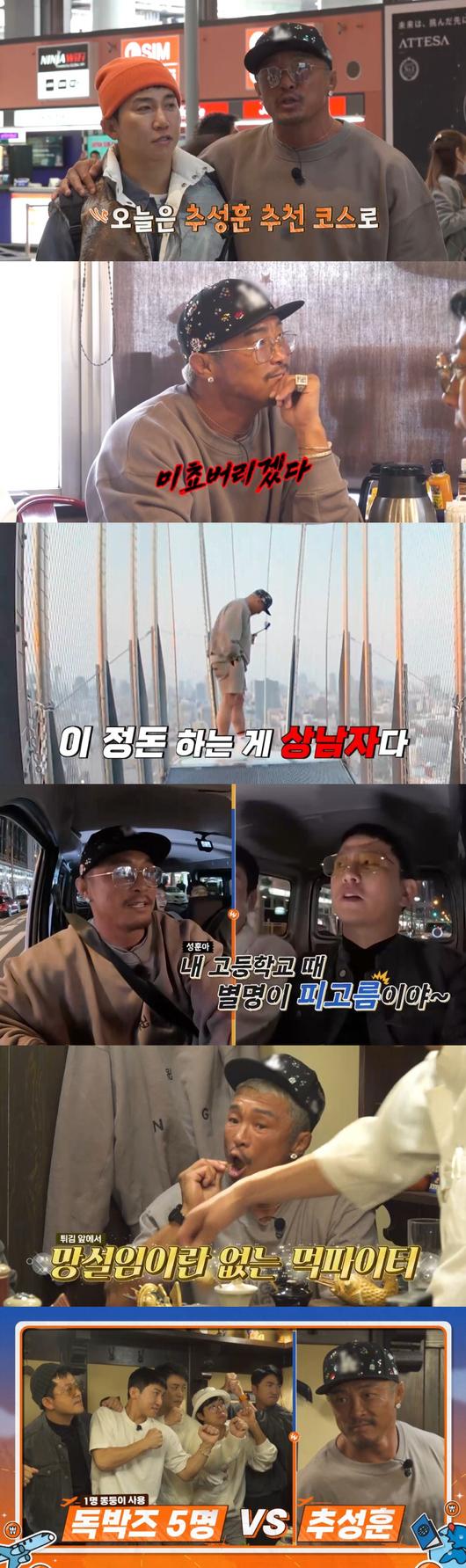 이후, 추성훈은 오사카의 대표 번화가인 '도톤보리'로 손수 차를 몰아 '독박즈'를 데리고 갔다. 이곳에서 이들은 '글리코상'을 배경으로 단체사진을 찍었으며, 추성훈이 예약한 '다코야끼 크루즈'에 탑승했다. 배 위에서 추성훈이 손수 만들어준 다코야끼를 맛본 이들은 행복해했고, '크루즈 비용'을 건 독박 게임에서는 추성훈이 제안한 '일본식 눈치 게임'을 한 결과, 또 다시 추성훈이 독박자가 됐다. 두 번 연속 독박에 걸린 추성훈에게 김대희는 "화 났냐"라고 물었는데 그는 "괜찮다"며 쿨하게 웃었다.