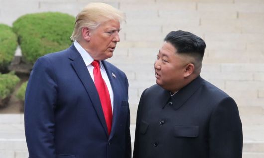 2019년 6월 30일 도널드 트럼프 미국 대통령과 북한 김정은 국무위원장이 판문점 군사분계선 북측 지역에서 만나 인사한 뒤 남측 지역으로 이동하기 전 대화하고 있다. 연합뉴스 |