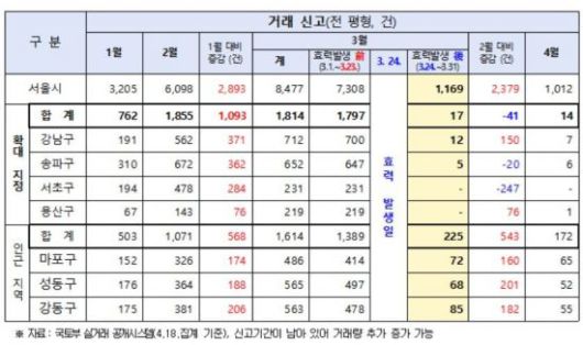 거래량 또한 지정 효력발생 이후 감소했다. 국토교통부 실거래 공개자료(4월18일 기준)에 따르면 서울시 전체 아파트 거래량은 지난 2월 6098건 대비 3월 8477건으로 2379건(39%) 증가했다.