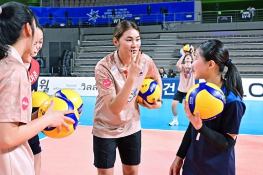 한국-태국 여자배구 올스타 슈퍼매치를 위해 태국 올스타팀을 이끌고 방한한 키아티퐁 랏차따끼엔까 태국 여자대표팀 선수들이 18일 경기 화성체육관에서 열린 유소년 아카데미에서 수일여중 선수들과 대화하고 있다. 2025.4.19 한국배구연맹 제공 |