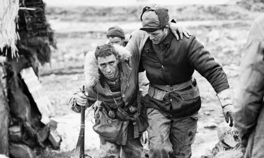 가평전투 직후 윌리엄 크라이슬러씨(오른쪽)가 부상당한 동료를 부축하여 이동하고 있다. 주한캐나다대사관 제공 |