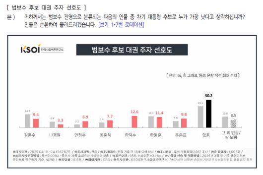 국민의힘 경선과는 별개로 '범보수 진영'에서의 대선 주자 선호도 조사에서는 한덕수 대행이 12.6%로 1위였고, 그 뒤를 한동훈(11.4%), 홍준표(9.8%), 김문수(9.6%), 이준석(7.7%), 안철수(6.9%), 나경원(3.3%) 등이 이었다. '없음'은 30.2%, '그 외 또는 잘 모름'은 8.5%였다.