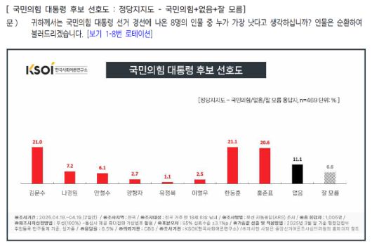 반면 '국민의힘' 또는 '무당층' 응답자로만 따져 보면 한동훈(21.1%), 김문수(21.0%), 홍준표(20.6%), 나경원(7.2%), 안철수(6.1%), 양향자(2.7%), 이철우(2.5%), 유정복(1.1%) 등우로 순위가 바뀌었다. '없음'은 11.1%, '잘 모름'은 6.6%였다.