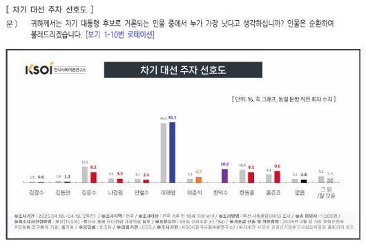 20일 CBS노컷뉴스가 한국사회여론연구소(KSOI)에 의뢰해 전국 만 18세 이상 남녀 1005명을 대상으로 지난 18일부터 19일까지 이틀간 진행한 여론조사에서 '차기 대통령 후보로 거론되는 인물 중 누가 가장 낫다고 생각하나'란 질문에 46.1%가 '이재명'이라고 응답했다.