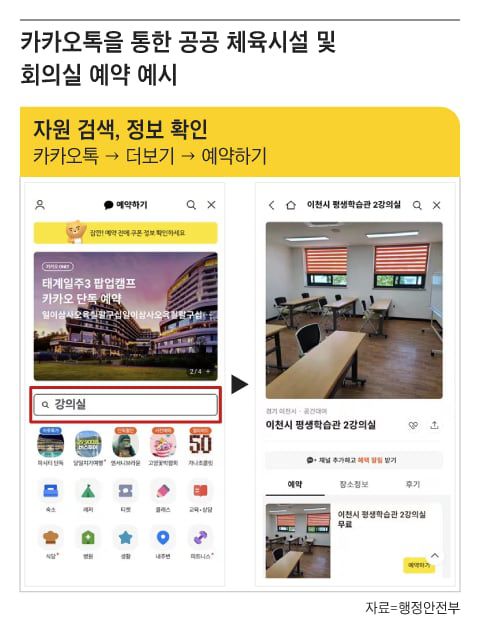 행정안전부가 21일부터 중앙부처와 지방자치단체, 공공기관이 보유한 전국 1200여개의 공공 체육시설 및 회의실을 네이버 지도와 카카오톡 등 민간 플랫폼에서 직접 예약할 수 있다고 20일 밝혔다.