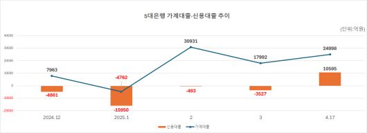 신용대출은 ▲지난해 12월 -4861억원 ▲올해 1월 -1조 5950억 원 ▲2월 -493억 원 ▲3월 -3527억 원으로 4개월 연속 감소세를 이어갔다. 이달 증가세는 영끌(영혼까지 끌어모아) 광풍이 일었던 지난 2021년 7월(1조 836억 원)이후 45개월 내 최고 증가 폭이다.