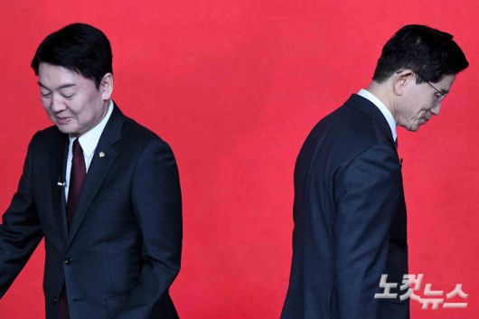 19일 서울 강서구 ASSA 아트홀에서 열린 국민의힘 대선 경선 후보 조별 토론회에서 안철수(왼쪽), 김문수 후보가 기념 촬영을 마친 뒤 자리로 돌아가고 있다. 박종민 기자 |
