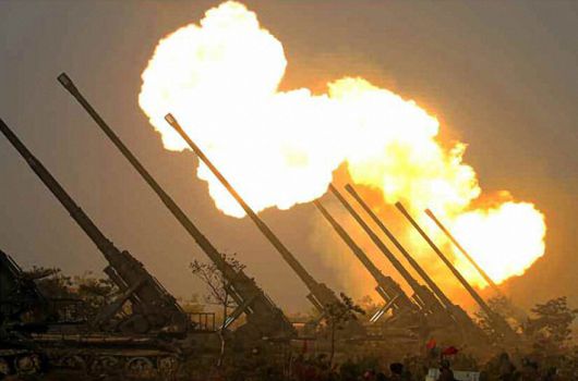 노동신문이 2020년 3월 10일 공개한 훈련 사진. 170㎜ 자주포로 추정되는 무기가 여러 발 발사되는 모습. 노동신문 홈페이지 캡처 |
