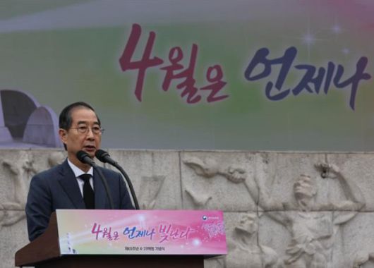 제65주년 4.19혁명 기념일인 19일 서울 강북구 국립 4.19민주묘지에서 한덕수 대통령 권한대행 국무총리가 기념사를 하고 있다. 왕태석 선임기자 |