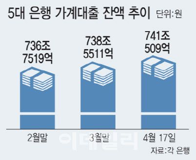 20일 금융권에 따르면 5대 은행의 지난 17일 기준 가계대출 잔액은 741조 509억원으로 집계됐다. 지난 3월 말(738조 5511억원)과 비교해 2조 4998억원 증가했다.