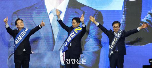 이재명·김경수·김동연 더불어민주당 대선 경선 후보(왼쪽부터)가 20일 울산광역시 울산전시컨벤션센터에서 열린 영남권 합동연설회에서 이동하고 있다. 울산 | 성동훈 기자 |