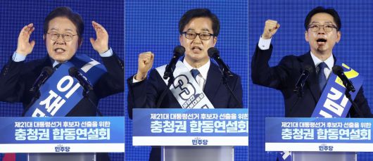 더불어민주당 이재명(왼쪽부터), 김동연, 김경수 대선 경선 후보가 19일 충북 청주체육관에서 열린 제21대 대통령선거 후보자 선출을 위한 충청권 합동연설회에서 정견발표를 하고 있다. 이날 이 후보는 충청 경선에서 득표율 88.15%로 압승했다. 김동연, 김경수 후보는 각각 7.54%, 4.31%이다. 2025.4.19 뉴스1 |