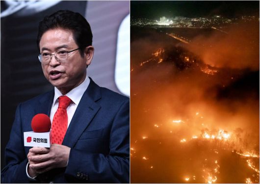 국민의힘 이철우 대선 경선 후보가 18일 서울 강서구 ASSA아트홀에서 열린 국민의힘 제21대 대통령후보자 1차 경선 비전대회에서 비전을 발표하고 있다. (왼쪽) 지난 3월25일 경북 안동시 남선면 인근 야산으로 불이 번지는 모습. 연합뉴스, 국회사진기자단 |
