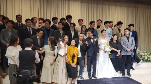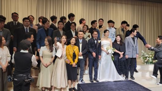 하객들의 단체 사진 촬영 시간, 현장은 마치 ‘셀럽 월리를 찾아라’ 같은 풍경으로 웃음을 자아냈다. 자리 잡기 위해 분주히 움직이는 하객들 사이에서 오는 7월 결혼을 앞둔 예비부부 김준호♥김지민이 포착됐다.